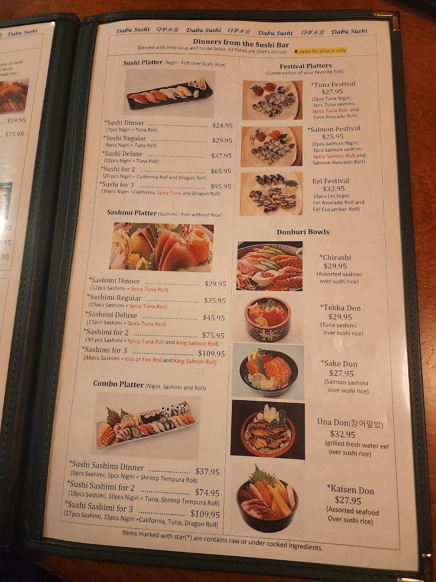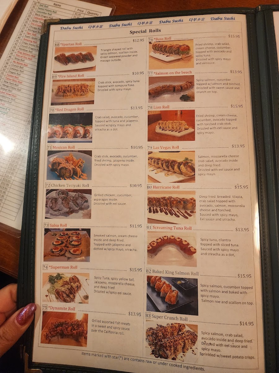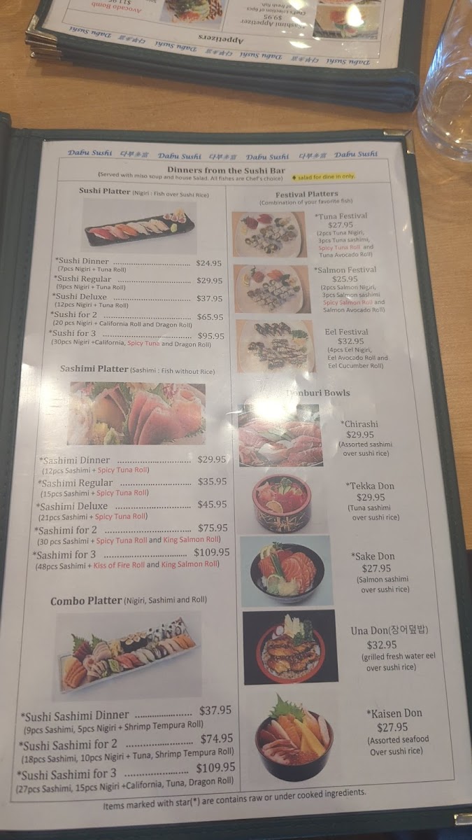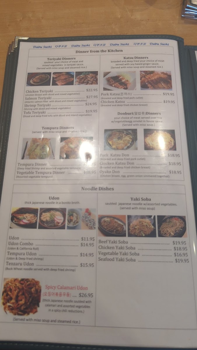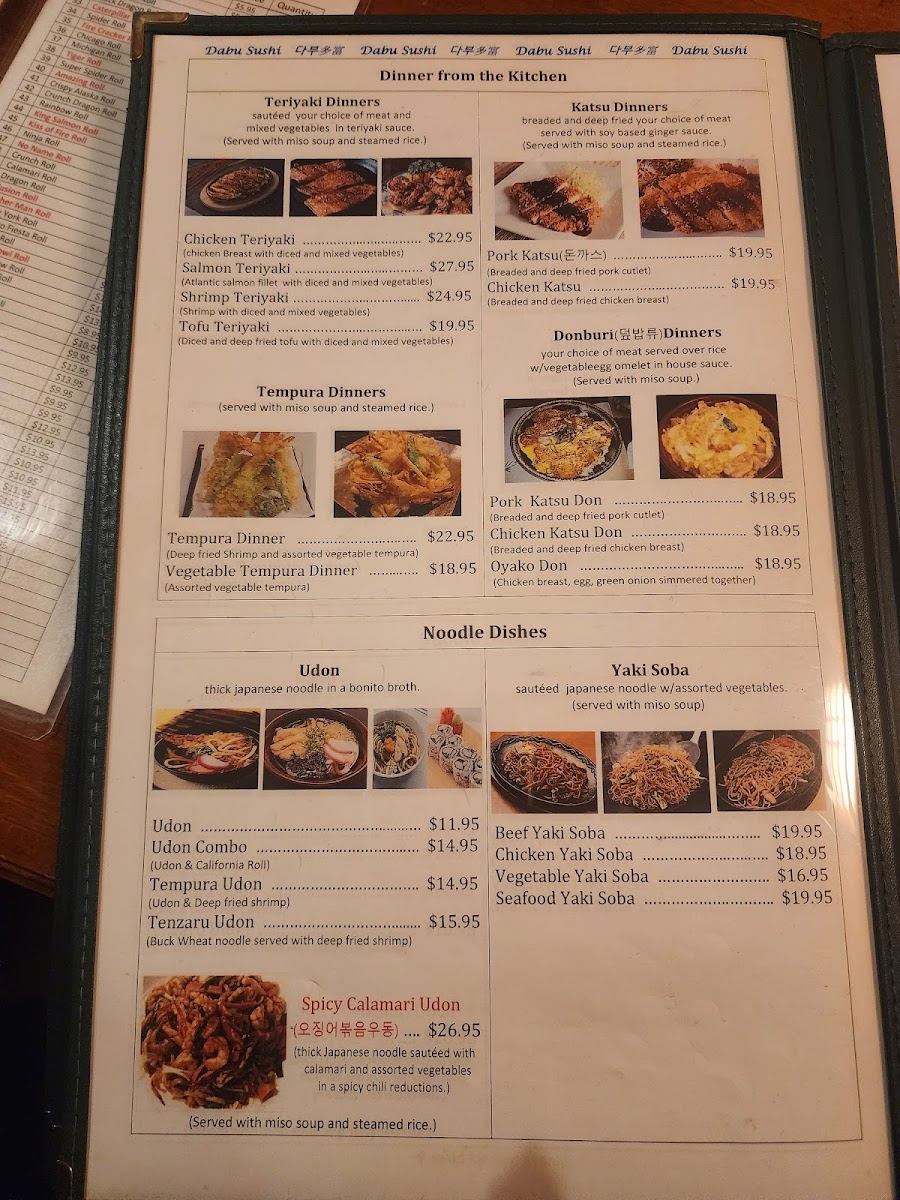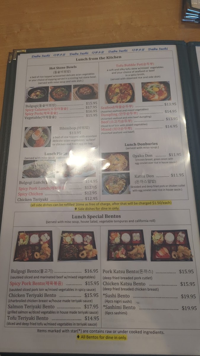 The menu at Sushi Dabu offers a balanced and approachable selection that reflects its blend of Japanese and Korean influences. It's a casual yet thoughtfully crafted lineup suited for a variety of occasions, whether you're stopping by for a satisfying lunch, a relaxed dinner, or a takeout meal to enjoy at home.